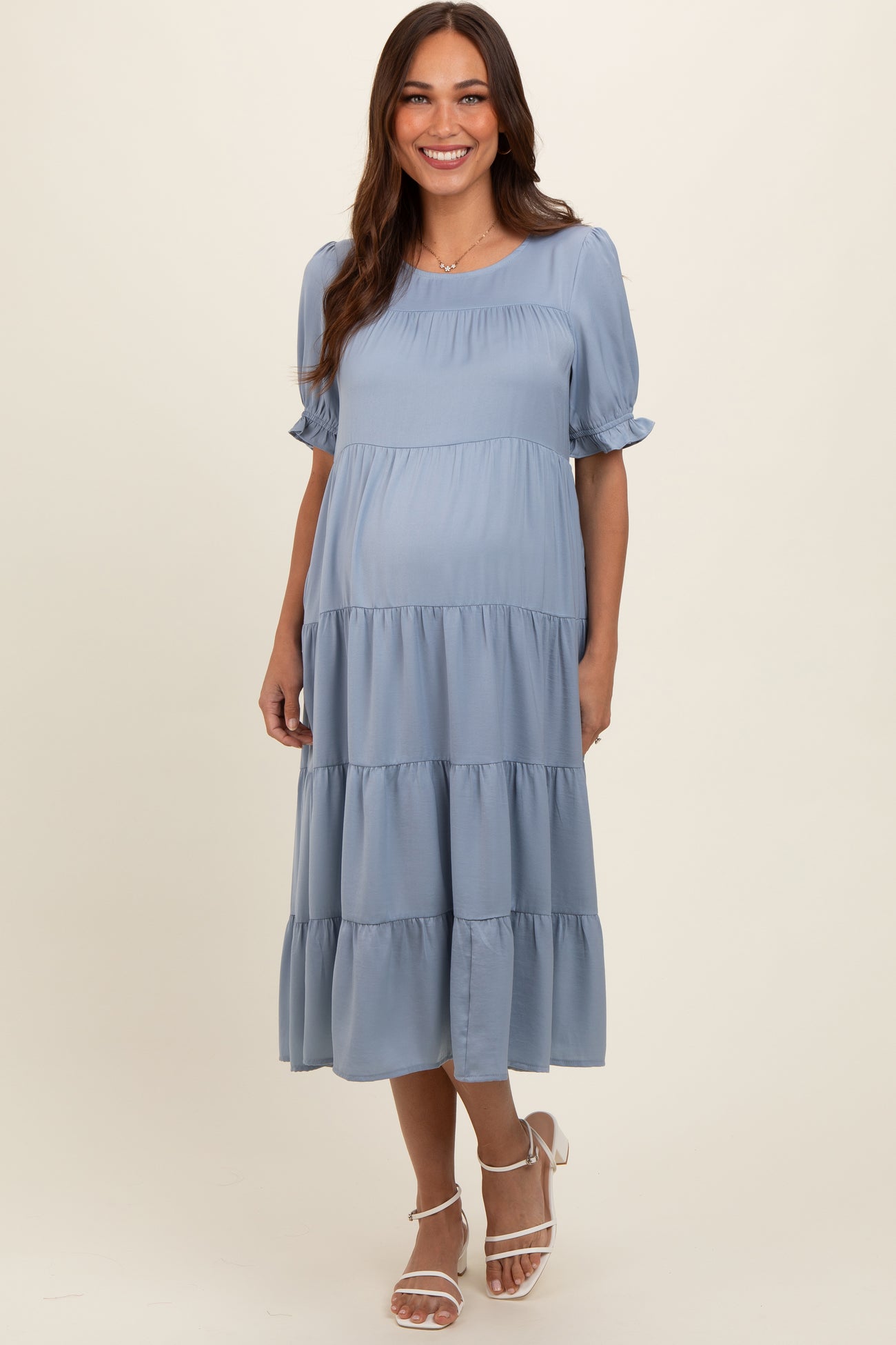 Solid maternity dress with short ruffle sleeves, tiered skirt, and side pockets.