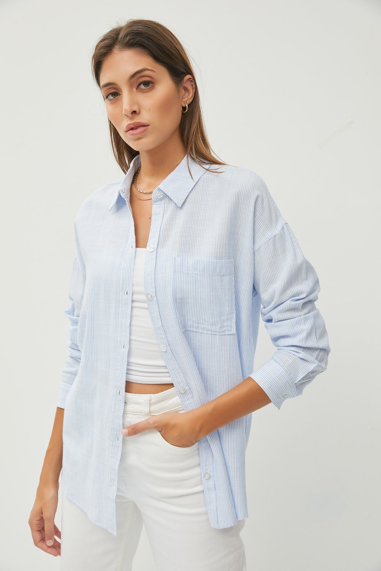A striped maternity long sleeve button down top with a collared neckline and front pocket detail.