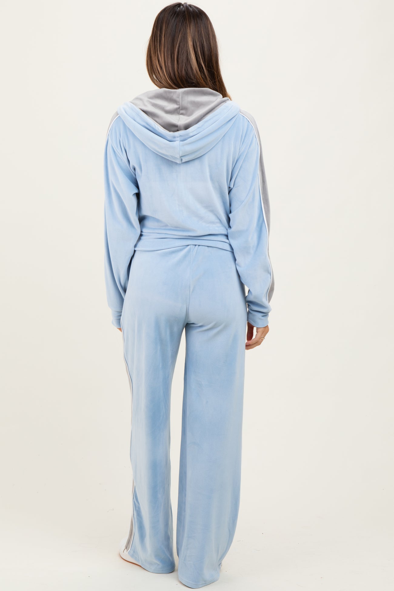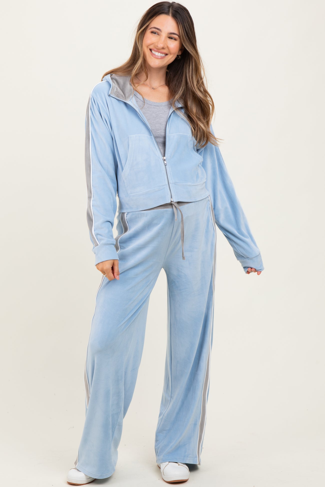 Stay cozy and stylish throughout your pregnancy with our Light Blue Velour Tracksuit Maternity Set. Crafted from ultra-soft velour fabric, this two-piece set includes a relaxed-fit hoodie and wide-leg pants designed to comfortably accommodate your growing bump. The light blue hue with contrasting side stripes adds a trendy sporty touch, perfect for casual days or lounging at home. Features an adjustable waistband for a custom fit and breathable material that keeps you comfortable all day long. Ideal for expecting moms who value comfort without compromising on style. Machine washable for easy care.
