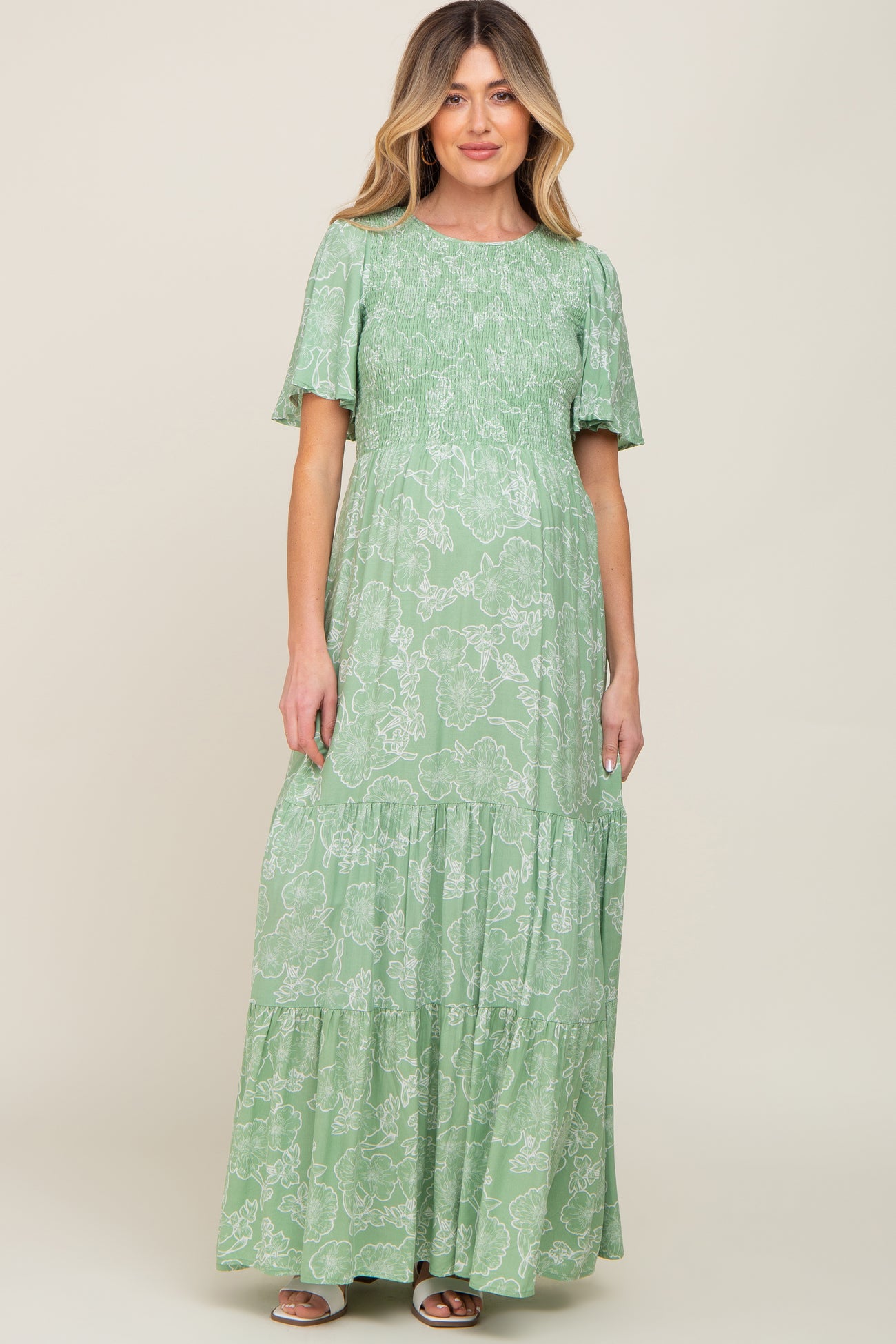 A floral maternity maxi that features short flounce sleeves, a rounded neckline, a smocked bodice, a tiered skirt, and a back tie. Dress is partially lined.