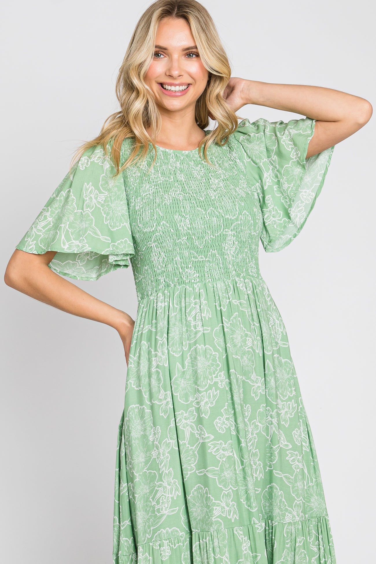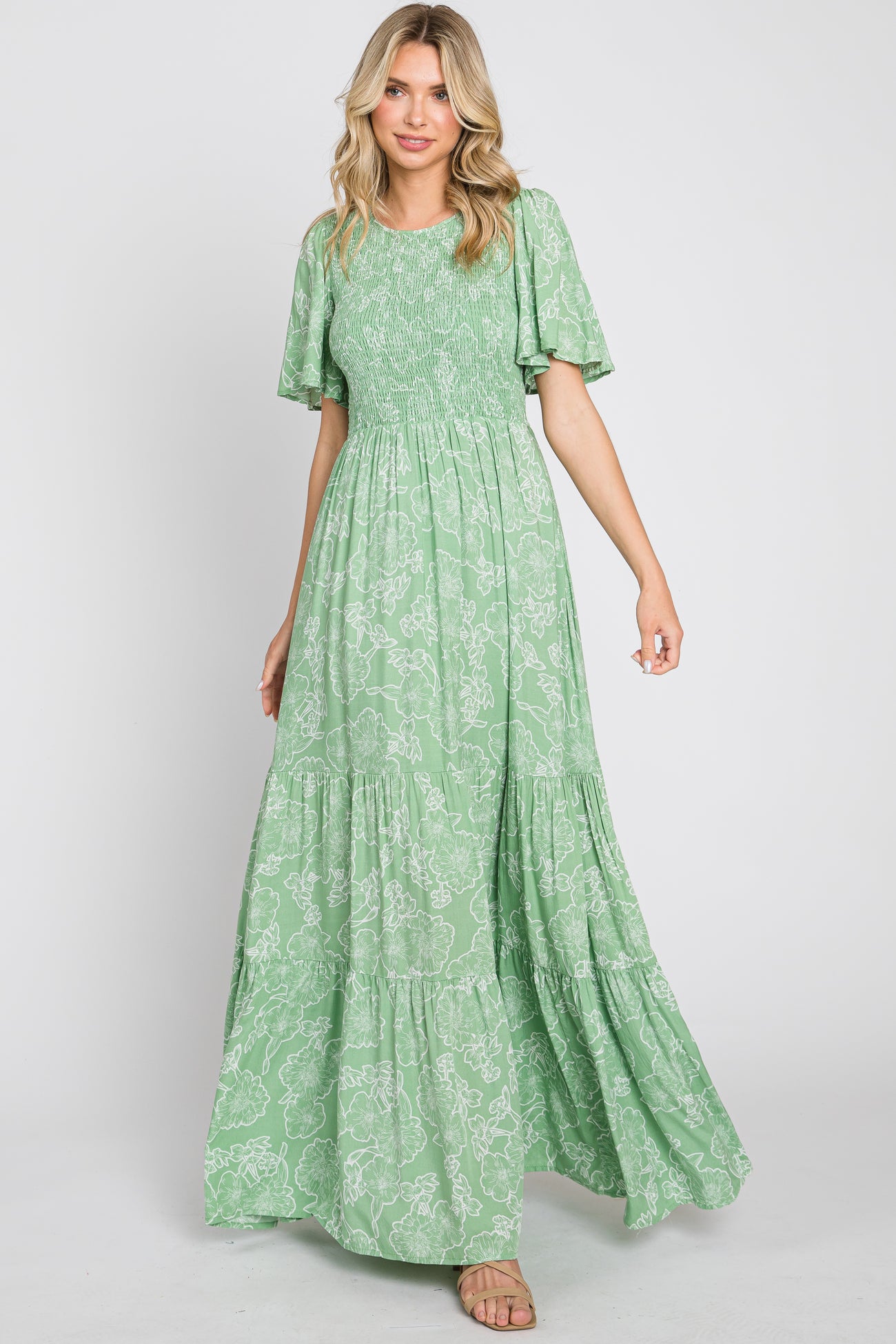 A floral maxi that features short flounce sleeves, a rounded neckline, a smocked bodice, a tiered skirt, and a back tie. Dress is partially lined.