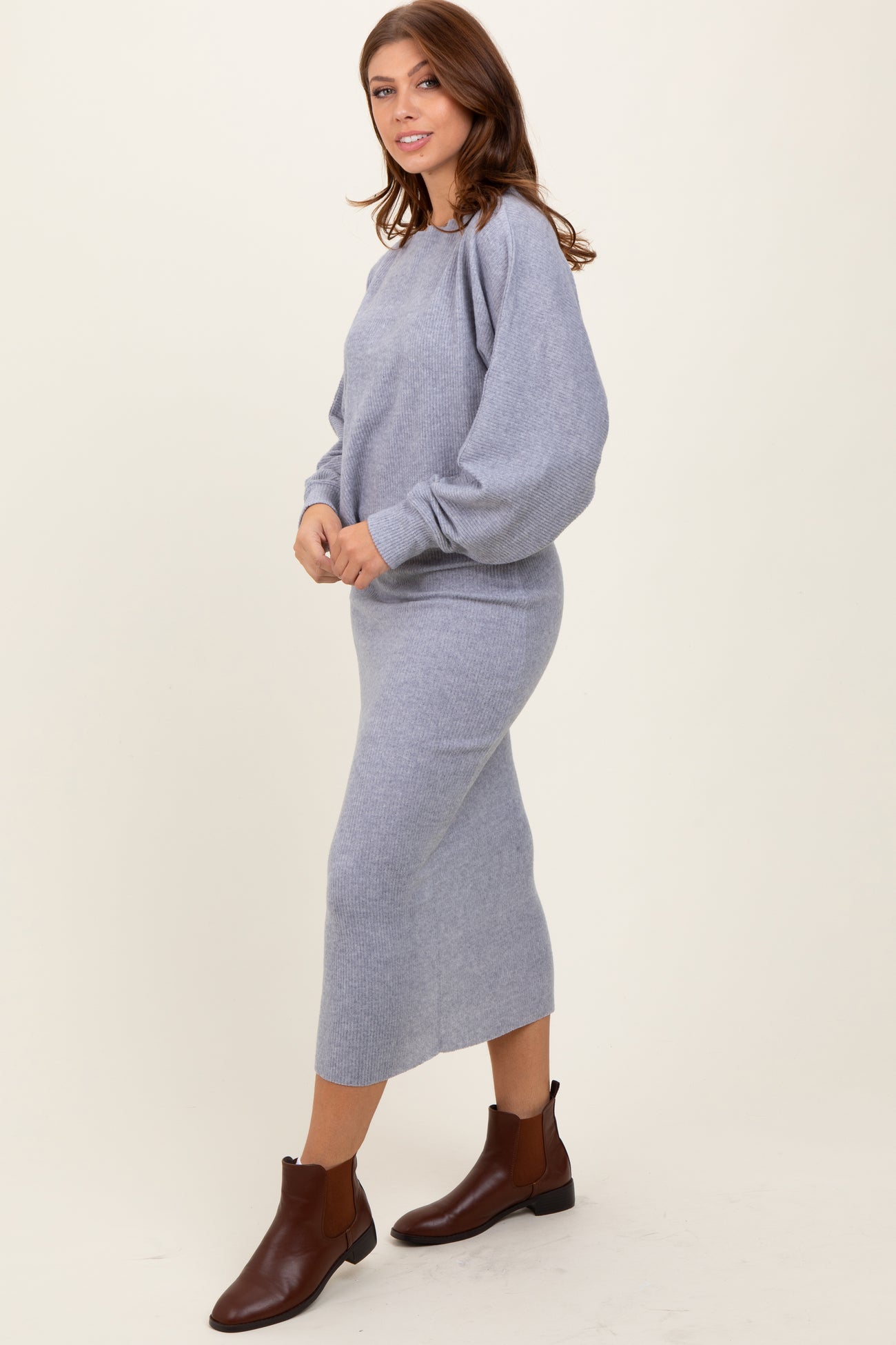Light Grey Ribbed Knit Asymmetric Top Midi Skirt Set