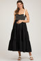 A solid dress featuring front buttons, a collared neckline, side pockets, a tiered skirt and short sleeves.