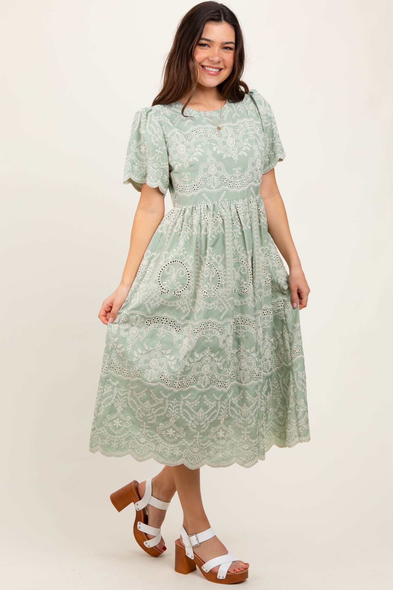 Step into effortless elegance with our Light Olive Floral Embroidered Tied Waist Midi Dress. Crafted with delicate floral embroidery on a soft light olive fabric, this dress features a flattering tied waist to accentuate your silhouette. The midi length and scalloped hem add a touch of vintage charm, while the short puff sleeves create a graceful, feminine look. Perfect for daytime events, brunch dates, or garden parties, this dress pairs beautifully with sandals or heels. Embrace comfort and style with a dress that's as versatile as it is stunning. Elevate your wardrobe with this timeless piece today!