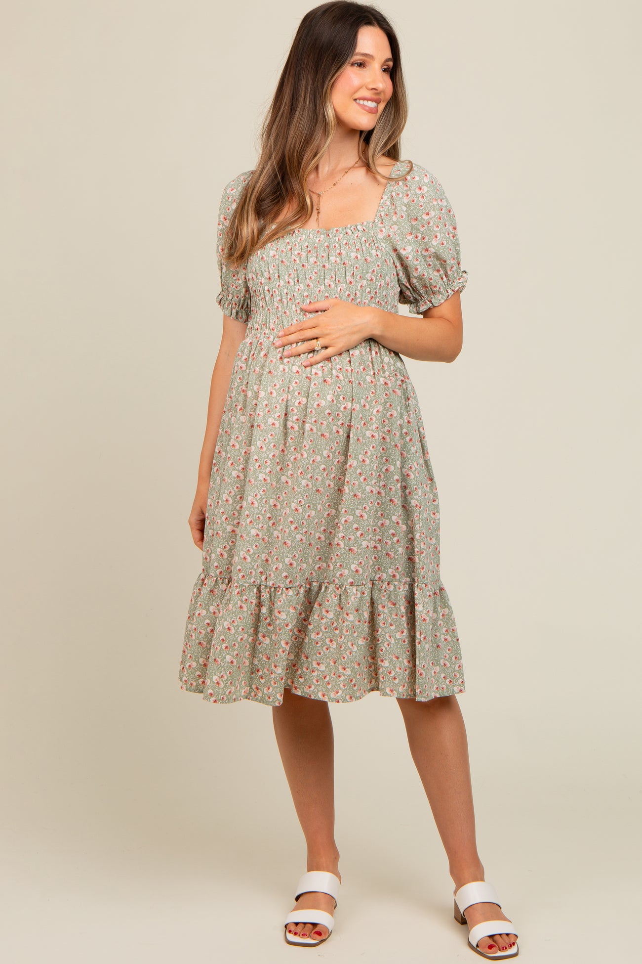 Embrace comfort and style with our Light Olive Floral Smocked Maternity Dress. This charming dress features a flattering smocked bodice that gently stretches to accommodate your growing bump, while the soft light olive fabric adorned with delicate floral prints adds a touch of effortless elegance. Designed with puff sleeves and a square neckline, it offers a feminine silhouette perfect for any season. The mid-length hem with a subtle ruffle detail ensures easy movement, making it ideal for both casual outings and special moments. Stay radiant throughout your pregnancy in this must-have maternity dress!