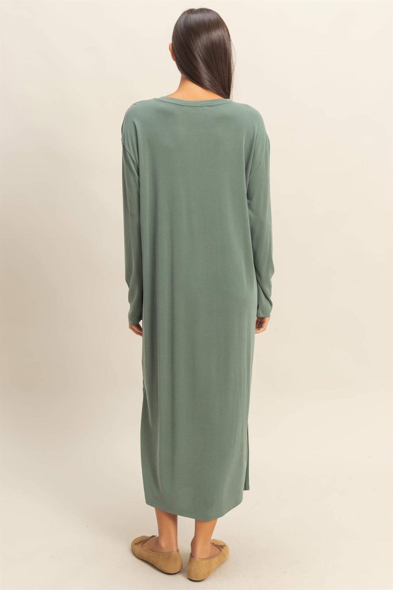 Elevate your everyday style with this Light Olive Oversized Long Sleeve Midi Dress. Crafted from soft, breathable fabric, this dress offers ultimate comfort and effortless chic. Featuring a relaxed oversized fit, a stylish chest pocket, and subtle side slits for ease of movement, it’s perfect for casual outings or lounging at home. The soothing light olive shade adds a touch of understated elegance, while the midi length and long sleeves make it ideal for transitional weather. Pair it with flats or sneakers for a laid-back look or dress it up with accessories for a minimalist statement. A versatile wardrobe essential you’ll reach for again and again.