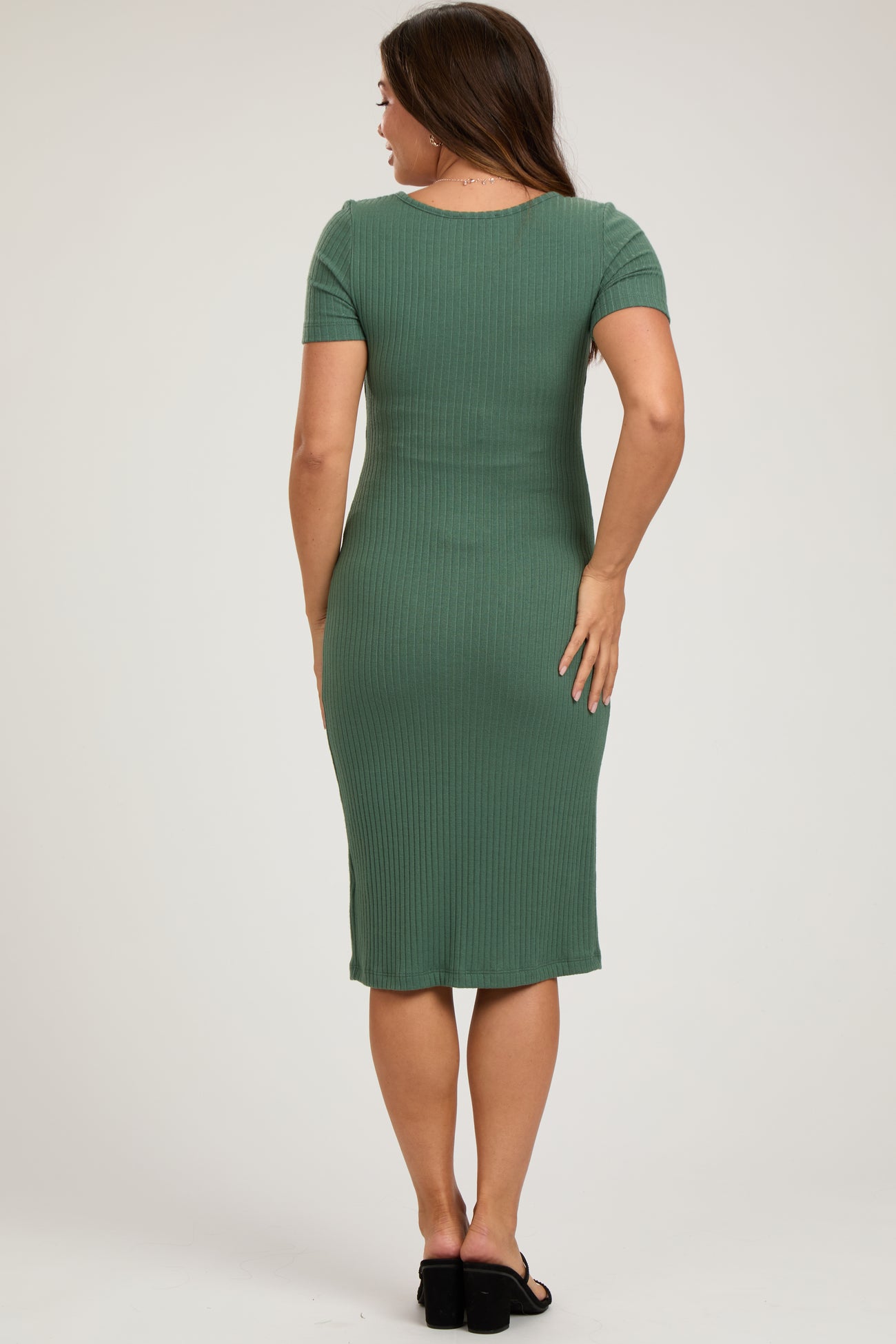 Light Olive Ribbed Front Button Accent Short Sleeve Maternity Midi Dress