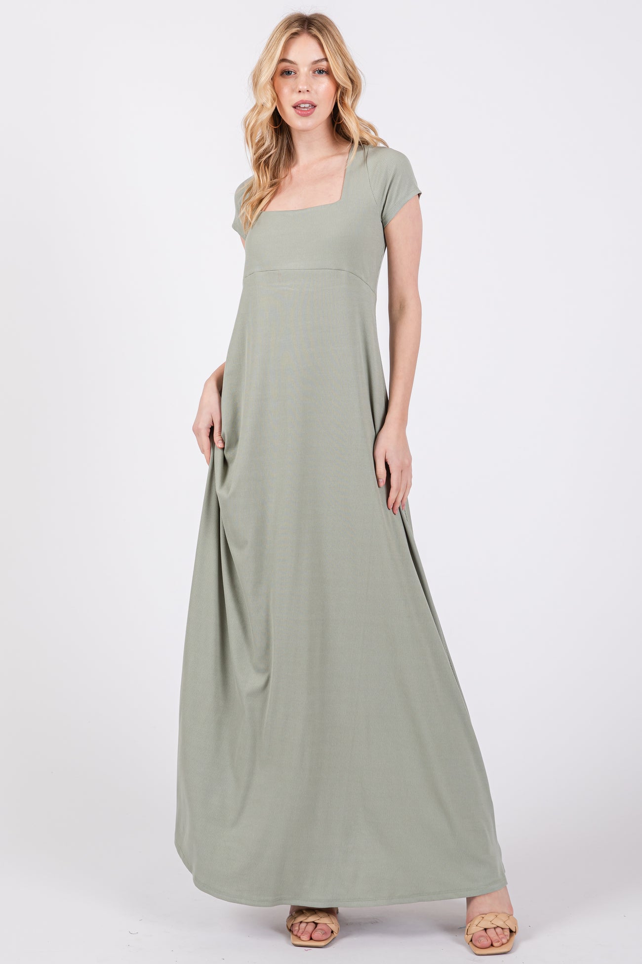A ribbed knit maternity maxi dress featuring a square neckline, short sleeves, an empire waist and an A-line skirt.