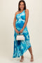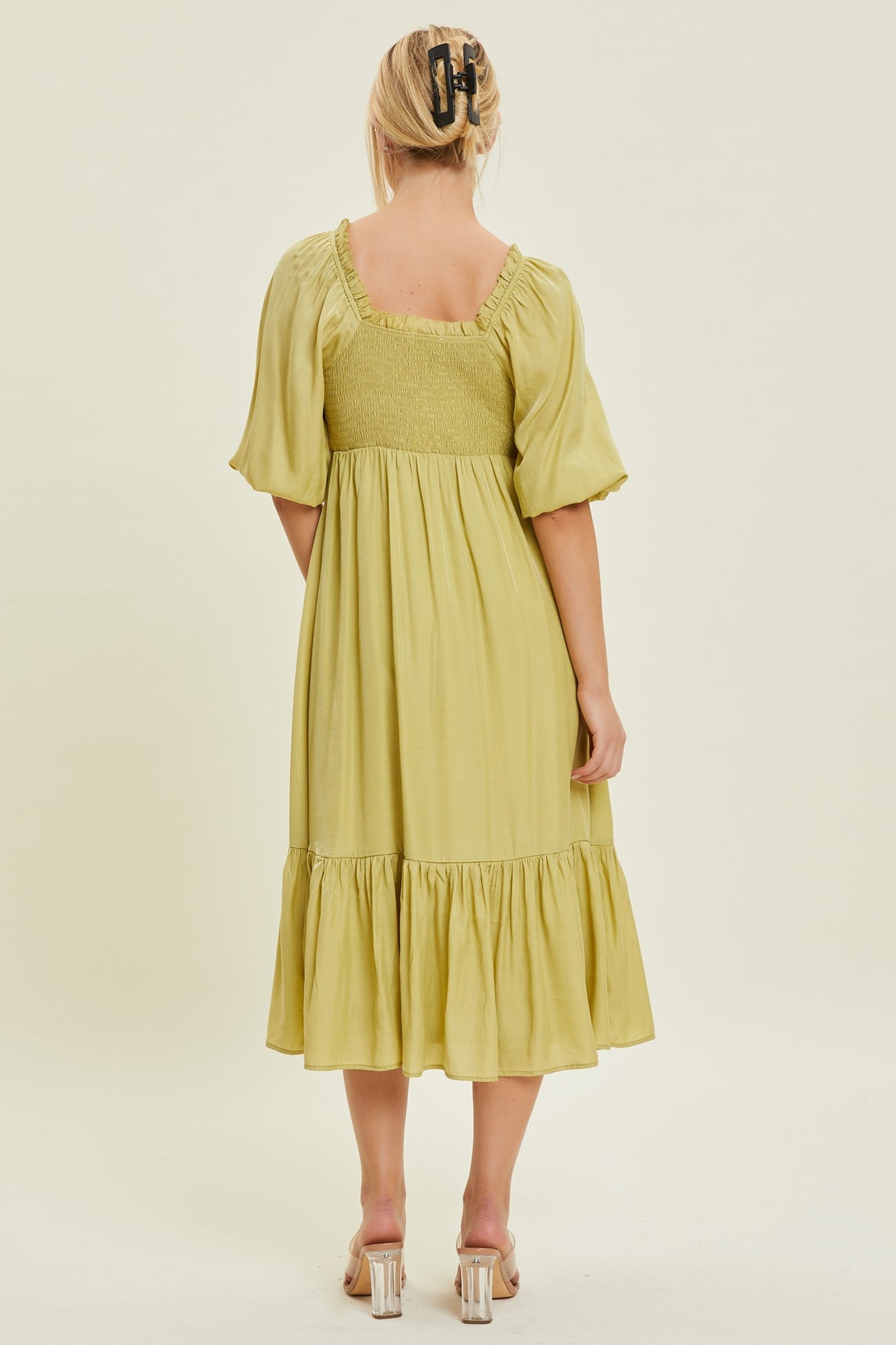 A solid hue midi dress with a ruffle accent v-neckline, a smocked top, a front tie at the bust, half-length sleeves, and a gathered bottom tier. Body is fully lined.