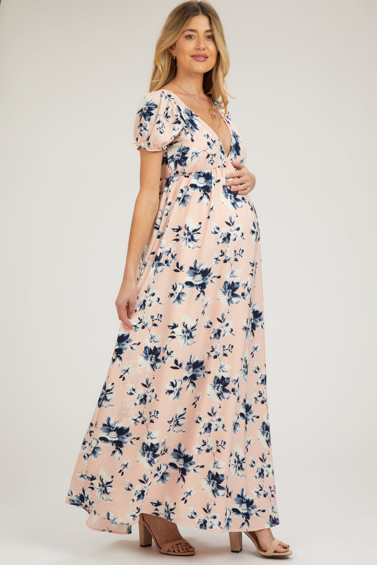 Light Pink Floral V-Neck Puff Sleeve Maternity Maxi Dress