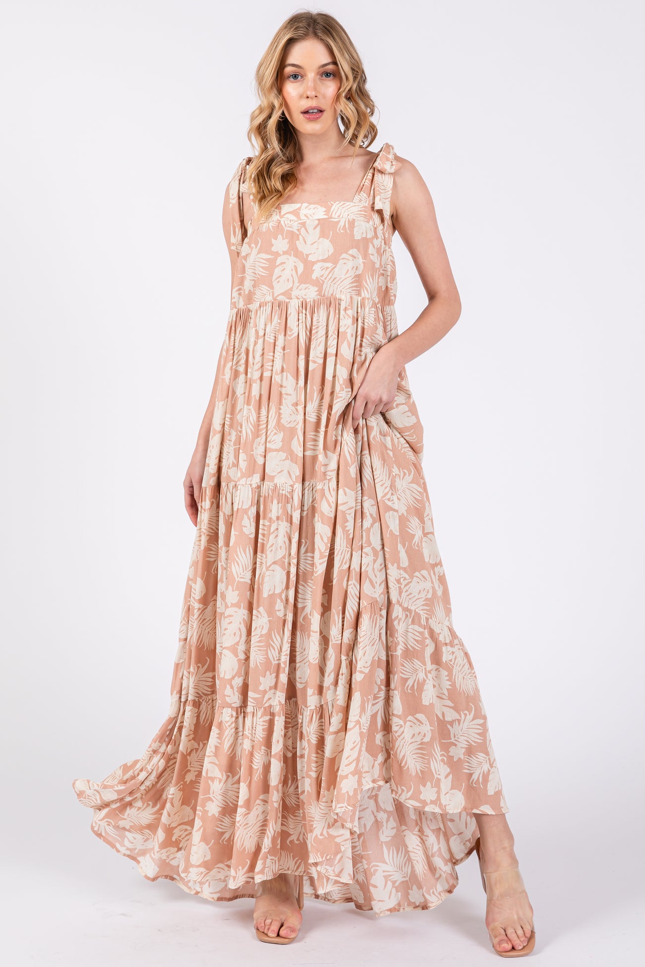 A leaf printed maternity maxi dress featuring a square neckline, adjustable tie straps, a tiered skirt and double lining.