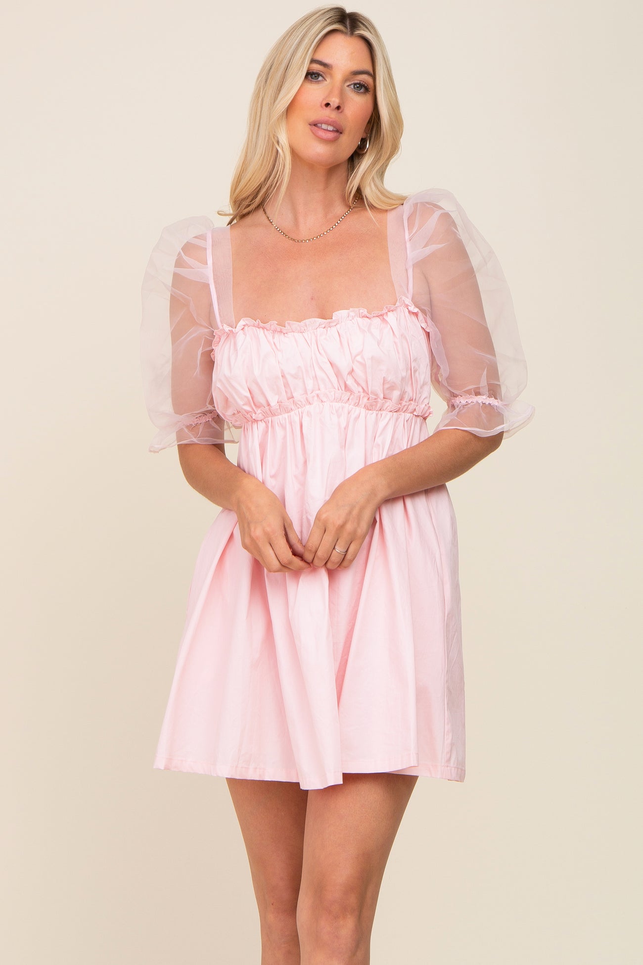 A solid mini dress with a ruched sweetheart neckline, sheer mesh puff sleeves, back tie and smocked back. Zipper with hook eye closure in back. Skirt is lined. Pocketed.
