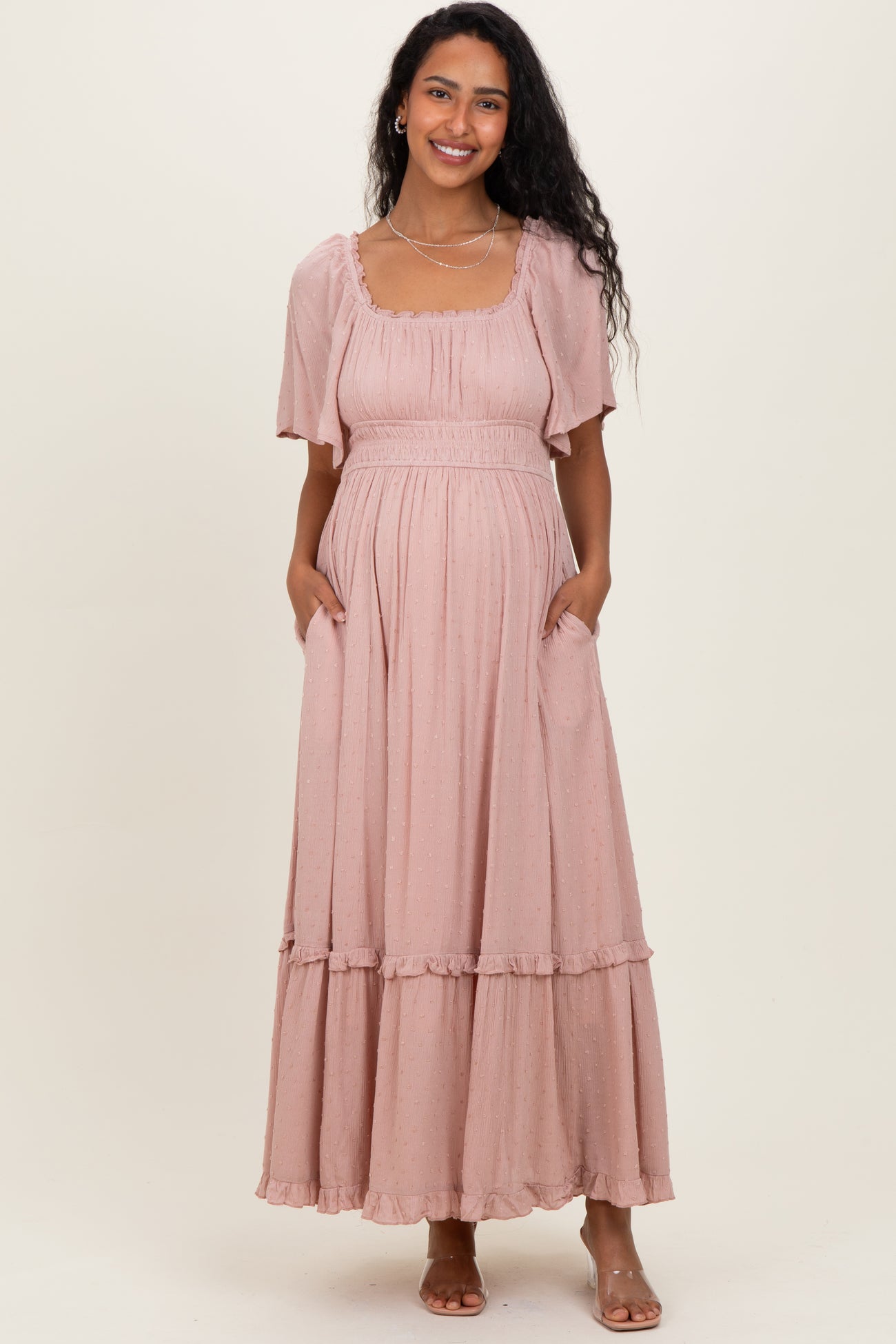 Embrace effortless elegance with our Light Pink Swiss Dot Ruffle Trim Maternity Maxi Dress. Crafted from soft, breathable fabric, this dress features a delicate Swiss dot texture that adds a subtle charm. The square neckline and flutter sleeves frame you beautifully, while the elasticized waist and smocked detailing provide a comfortable, flattering fit that grows with your bump. Designed for both style and comfort, its flowing maxi length and gentle ruffle trims create a graceful silhouette. Complete with convenient side pockets, this dress is perfect for baby showers, casual outings, or special occasions. Feel radiant and comfortable throughout your pregnancy with this must-have maternity maxi dress.