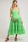 A solid maternity midi dress with self tie straps, tiered body, and ruffle accents. Dress is lined. Pocketed.