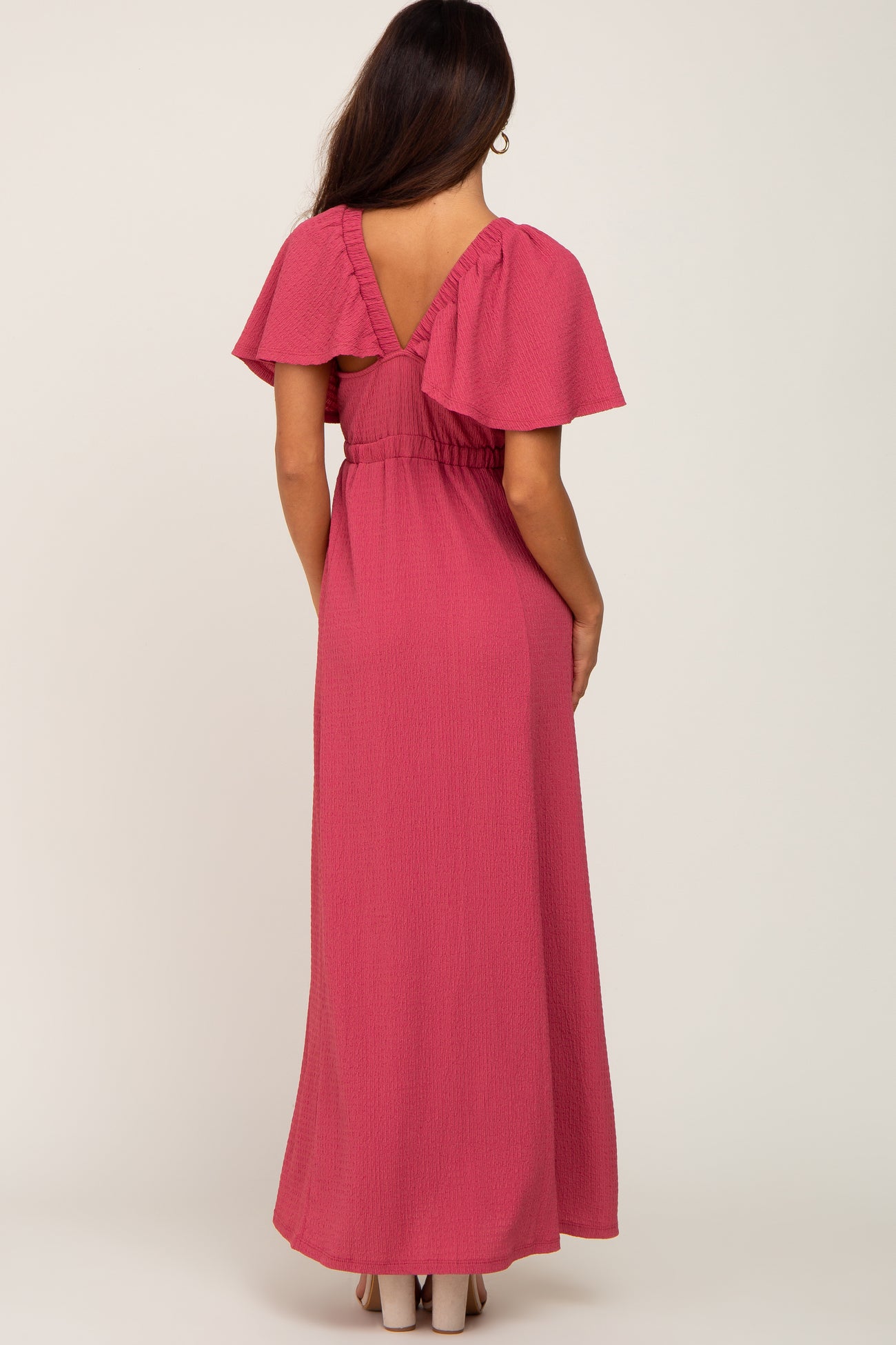 Details A solid maxi dress featuring crepe fabric, a deep v-neckline, and short flounce sleeves. Content + Care