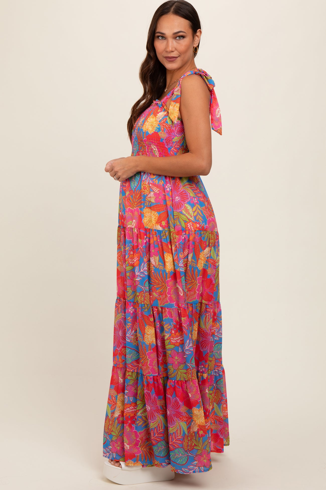 Magenta Floral Shoulder Tier Smocked Maternity Maxi Dress