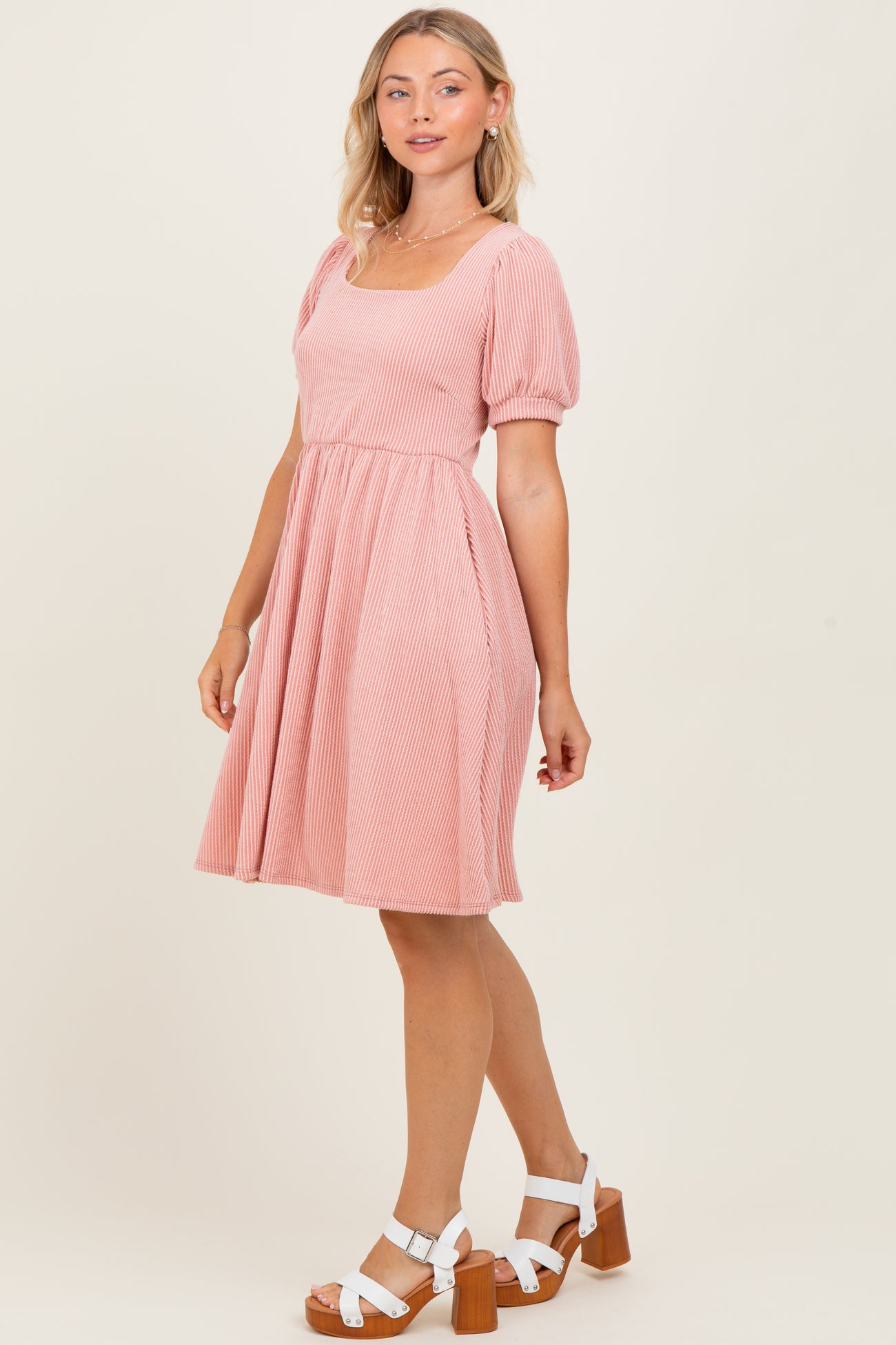 Mauve Square Neck Puff Sleeve Rib Babydoll Dress