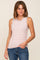 A striped tank top with a rounded neckline. Raw hem trim located at the neckline and sleeve openings.