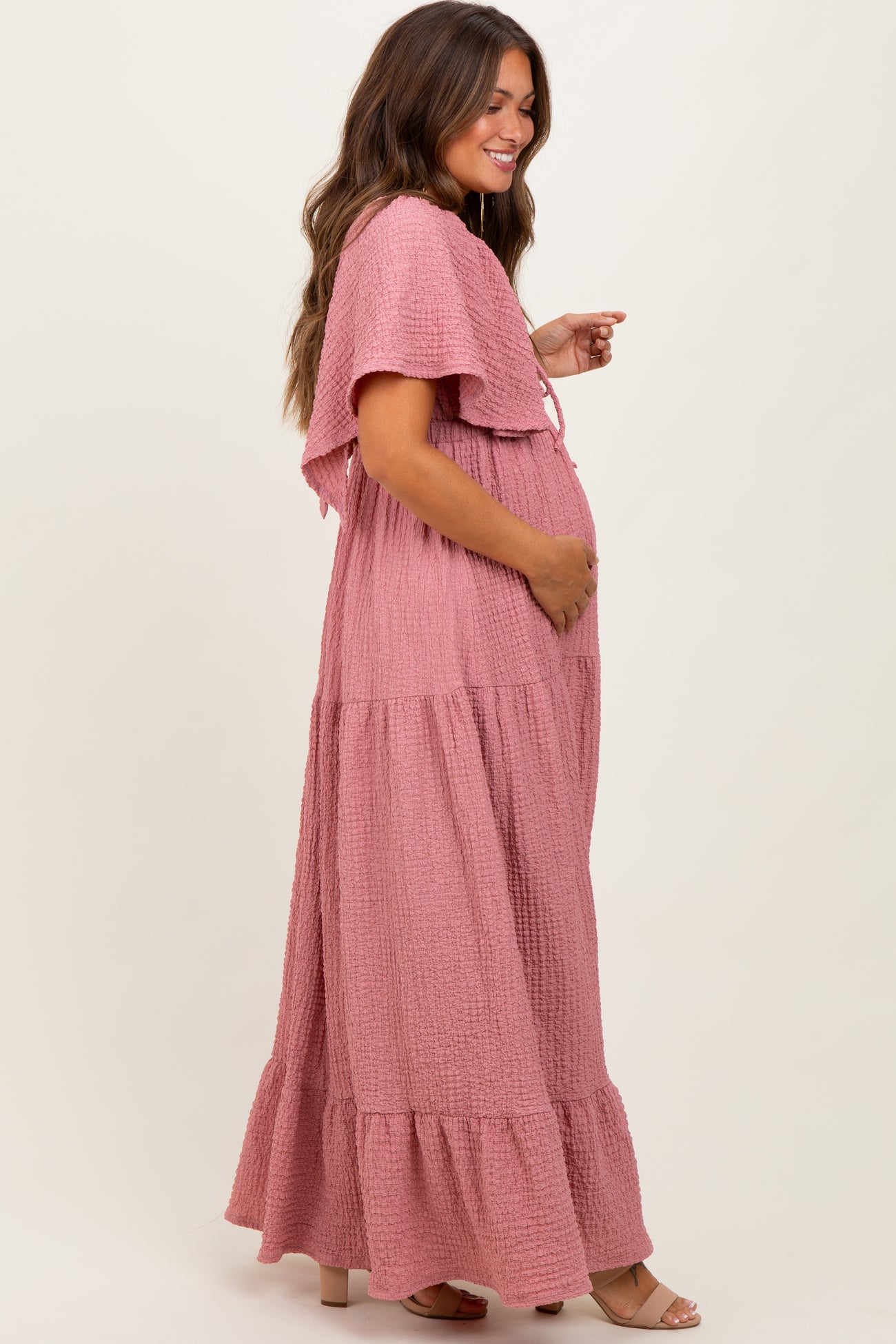 Mauve Woven Textured Flutter Sleeve V-Neck Tiered Maternity Maxi Dress