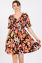 A floral print maternity midi dress featuring a smocked top, short puff sleeves, side pockets, a ruffle hem and a square neckline.