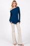 A solid hued maternity top featuring long sleeves and an asymmetrical off shoulder neckline.