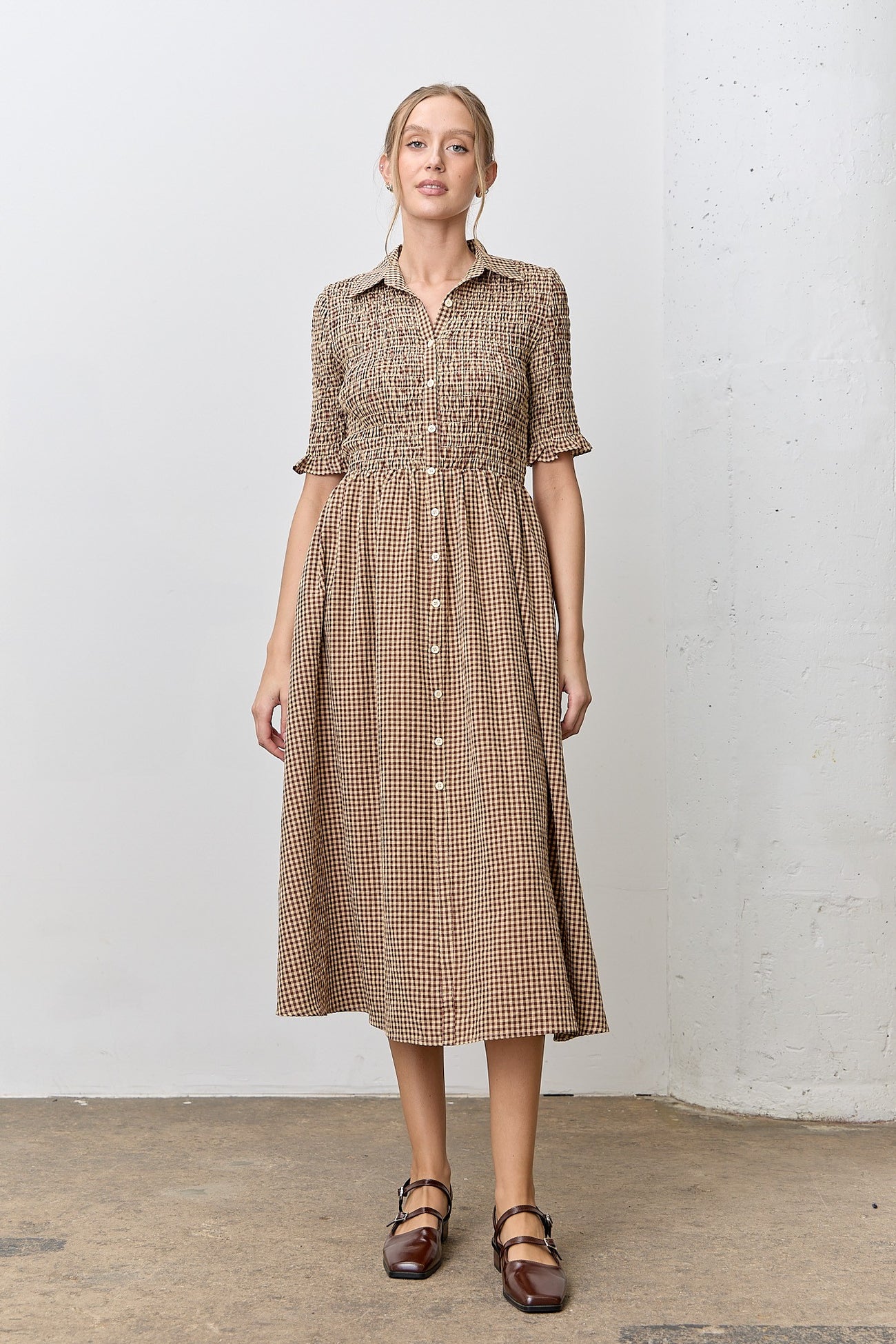 Mocha Gingham Smocked Button Down Midi Dress