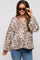 A leaf print maternity top with front functioning buttons, a mandarin collar, long drop shoulder sleeves, and mocked top accents under the collar.