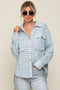 A leaf print top with front functioning buttons, a mandarin collar, long drop shoulder sleeves, and mocked top accents under the collar.