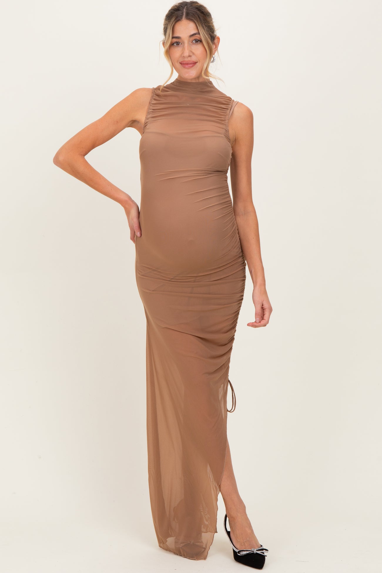 Mocha Mesh Ruched One Sleeve Maternity Maxi Dress