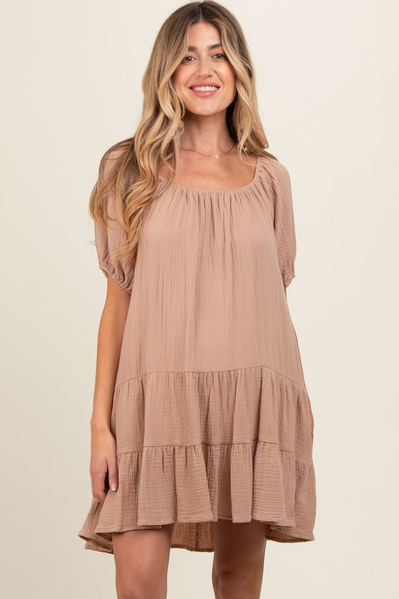 Mocha Ribbon Back Detail Puff Sleeve Maternity Mini Dress