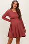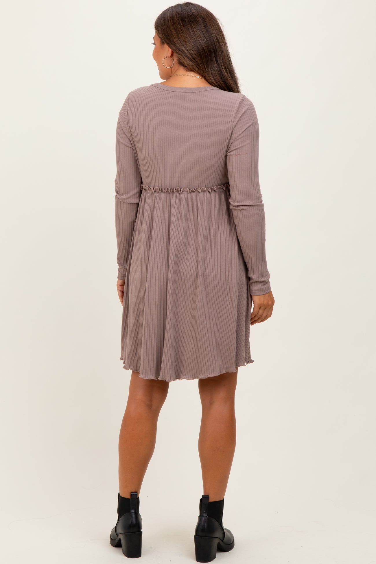 Mocha Solid Ribbed Long Sleeve Crewneck Shirring Maternity Mini Dress