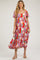 A multi-color print maternity midi dress featuring a square neckline, short puff sleeves, a smocked elastic back, a back zipper, an empire waist and an a-line skirt with double lining.