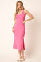 A solid hued fitted maternity dress featuring short sleeves, a rounded neckline and side ruching.