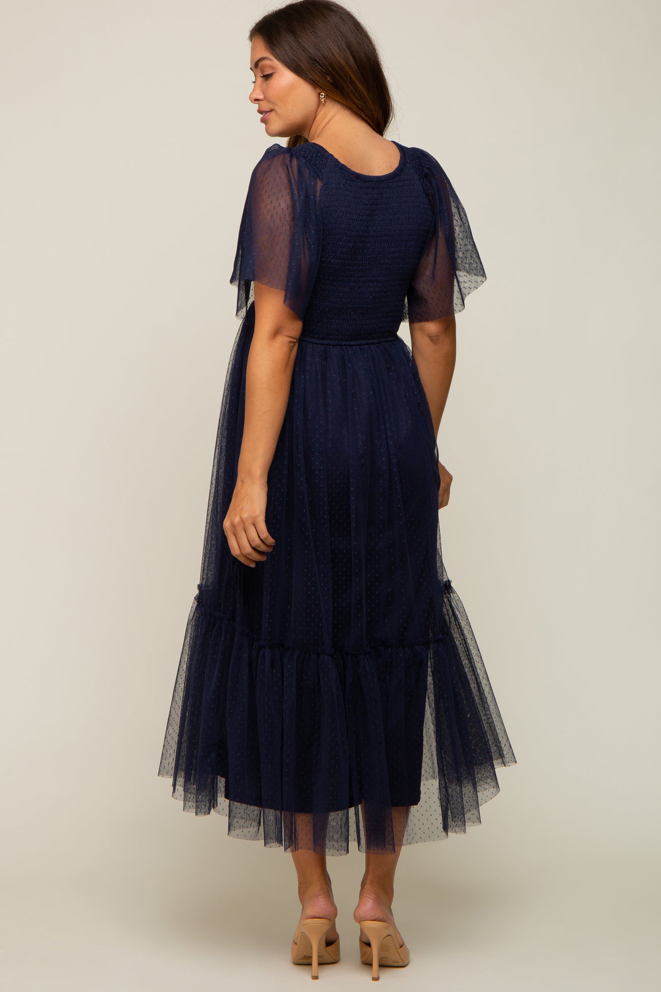 Navy Blue Dotted Tulle Smocked Maternity Midi Dress