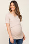 A ribbed knit maternity nursing top featuring a rounded neckline, short sleeves, a wrap front and easy access for nursing.