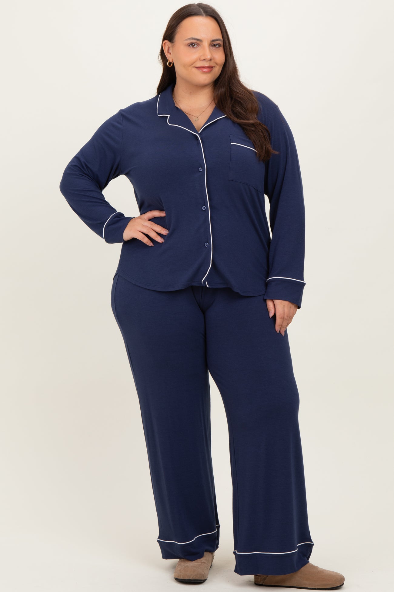 Navy Button Down Top Wide Leg Pant Plus Pajama Set
