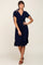 A solid short sleeve midi dress. Features crossover neckline, cinched short sleeves, and ruffle hem. Pocketed.