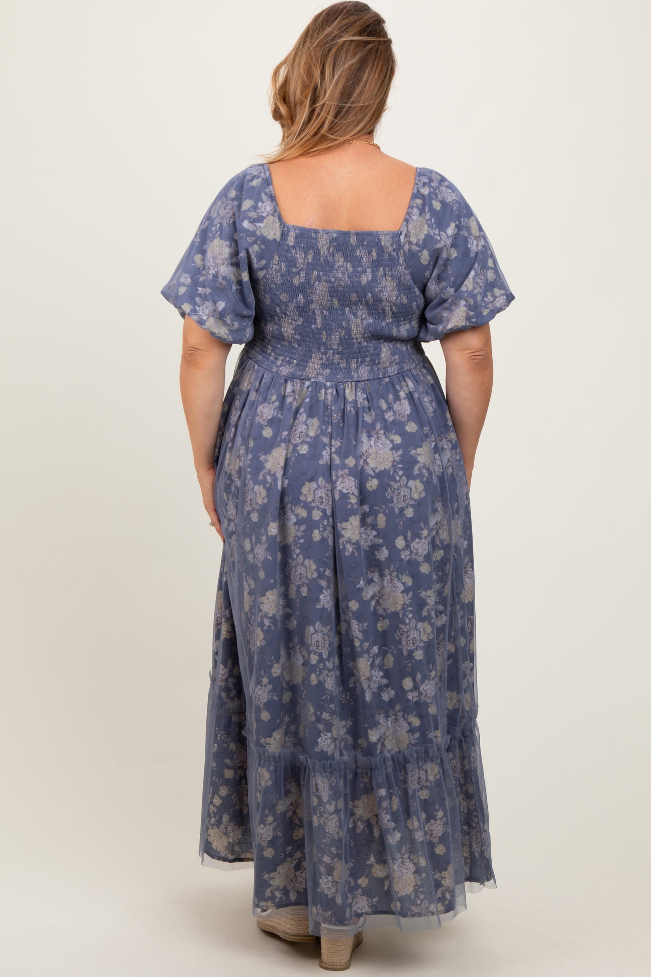Navy Floral Mesh Square Neck Short Puff Sleeve Maternity Plus Midi Dress