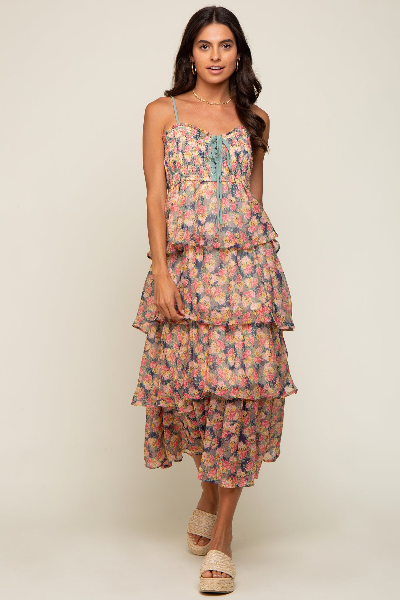 A floral sleeveless maxi dress featuring adjustable cami straps, a smocked top, a self-tie sweetheart neckline and a tiered skirt.