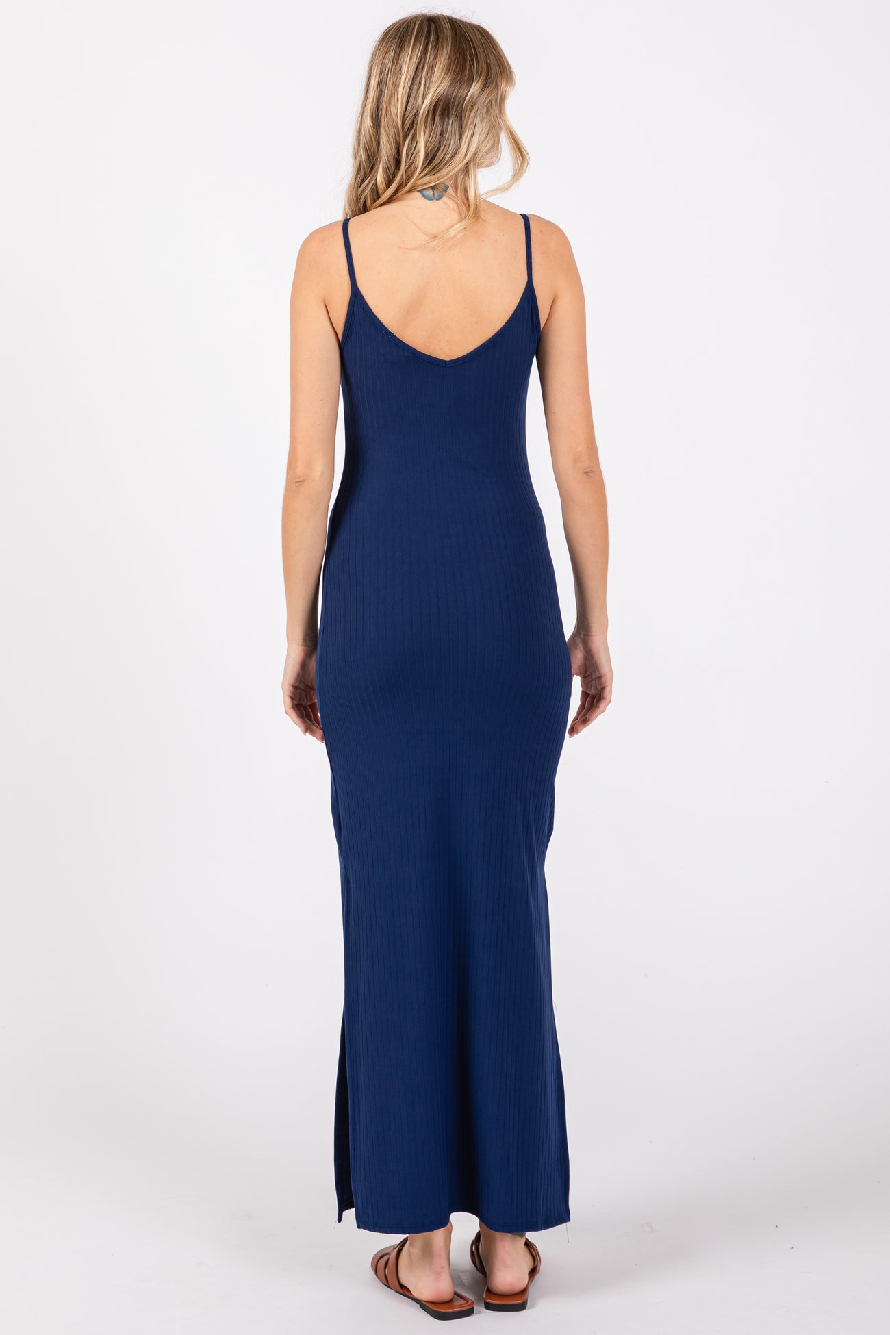 A solid ribbed maxi dress featuring cami straps, side slits and a v-neckline.