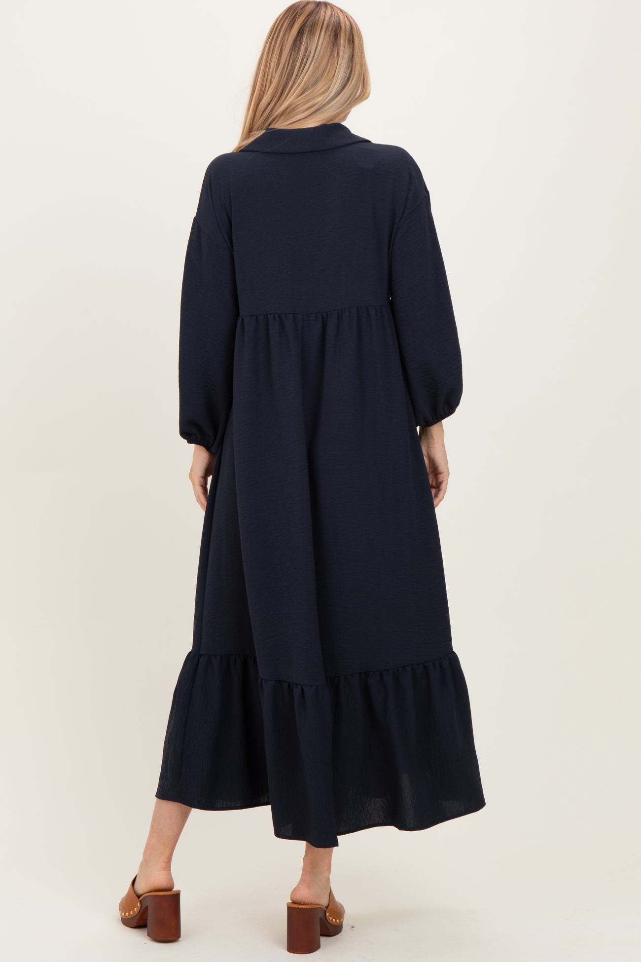 Navy Solid Long Sleeve Button Down Tiered Collared Dress