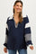 A stripe and color blocked maternity top with a split v-neckline, a collar, exposed seams, and side slits.