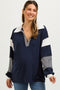 A stripe and color blocked top with a split v-neckline, a collar, exposed seams, and side slits.