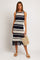 A crochet swimsuit coverup dress. Features a rounded neckline, a back tie closure at the neck, and a fringe hem.