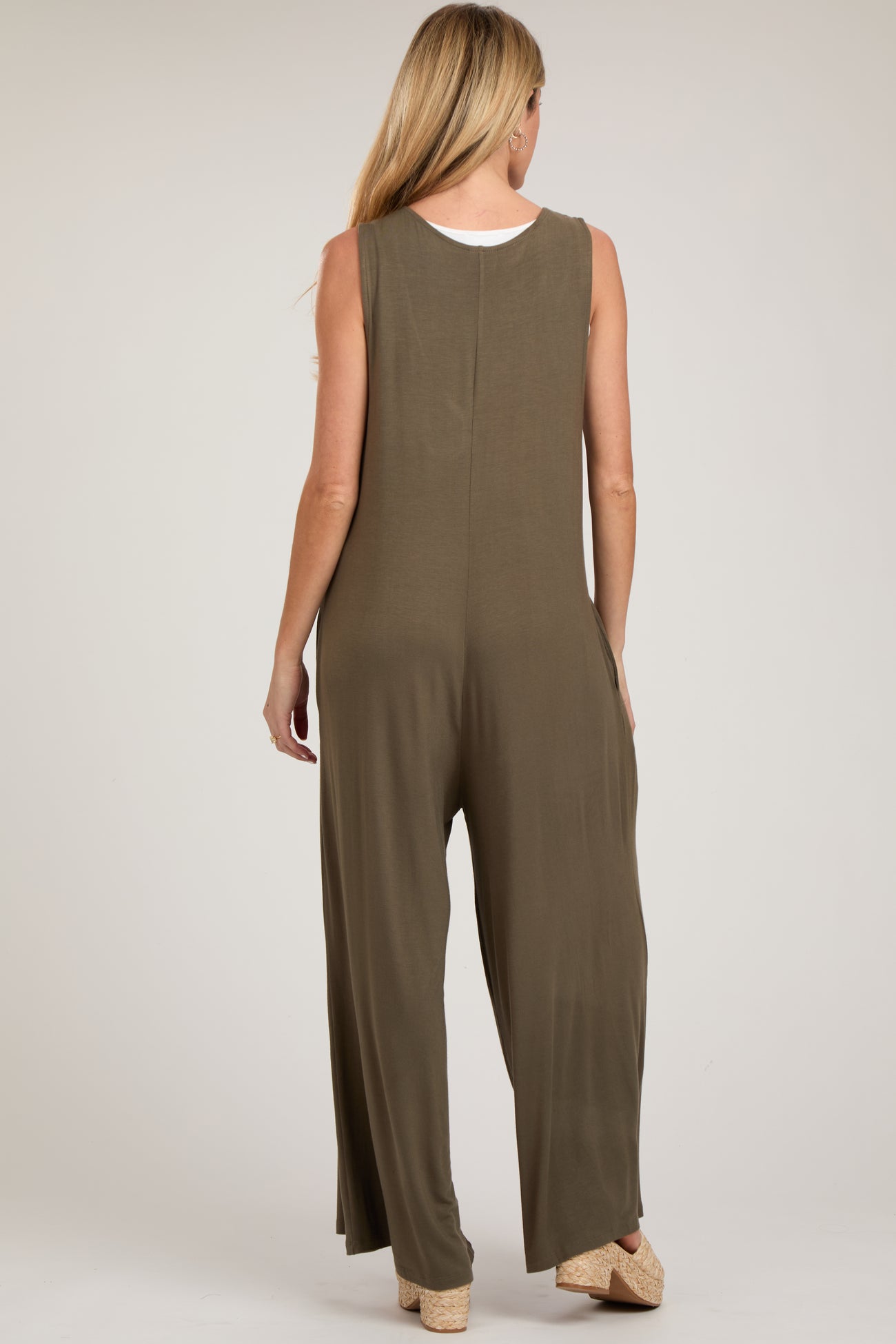 Olive Deep V Sleeveless Wide Leg Maternity Jumpsuit