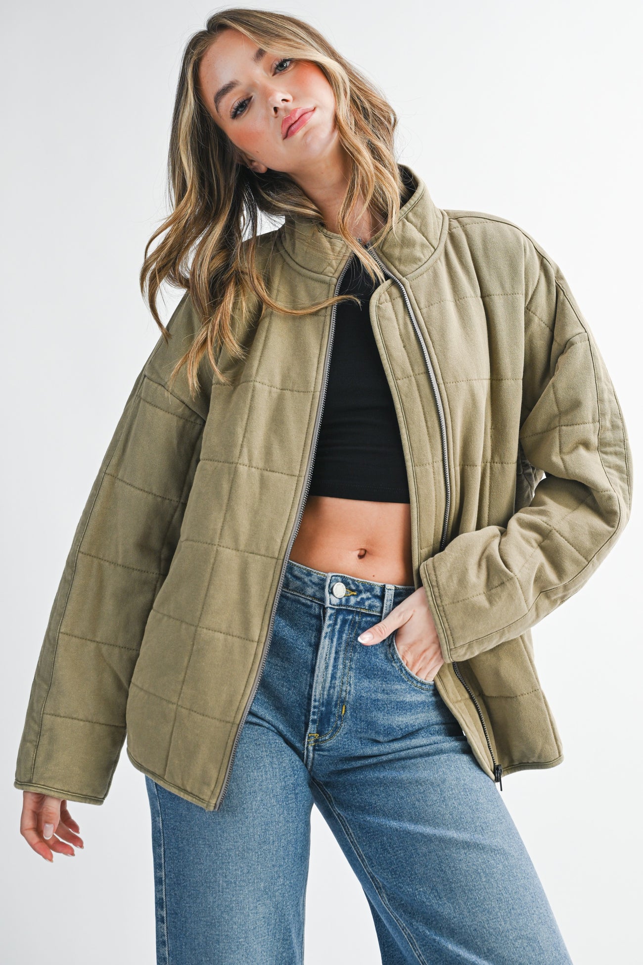 Stay cozy and stylish with our Olive Oversized Quilted Jacket, perfect for layering on chilly days. This jacket features a relaxed, oversized fit that combines comfort and a trendy street-ready vibe. The quilted design adds texture and warmth, while the high collar provides extra protection against the cold. Made from soft, durable fabric with a smooth zipper closure, it's ideal for casual outings or weekend adventures. Pair it effortlessly with your favorite jeans and crop tops for a laid-back yet polished look. Elevate your outerwear collection with this versatile staple!