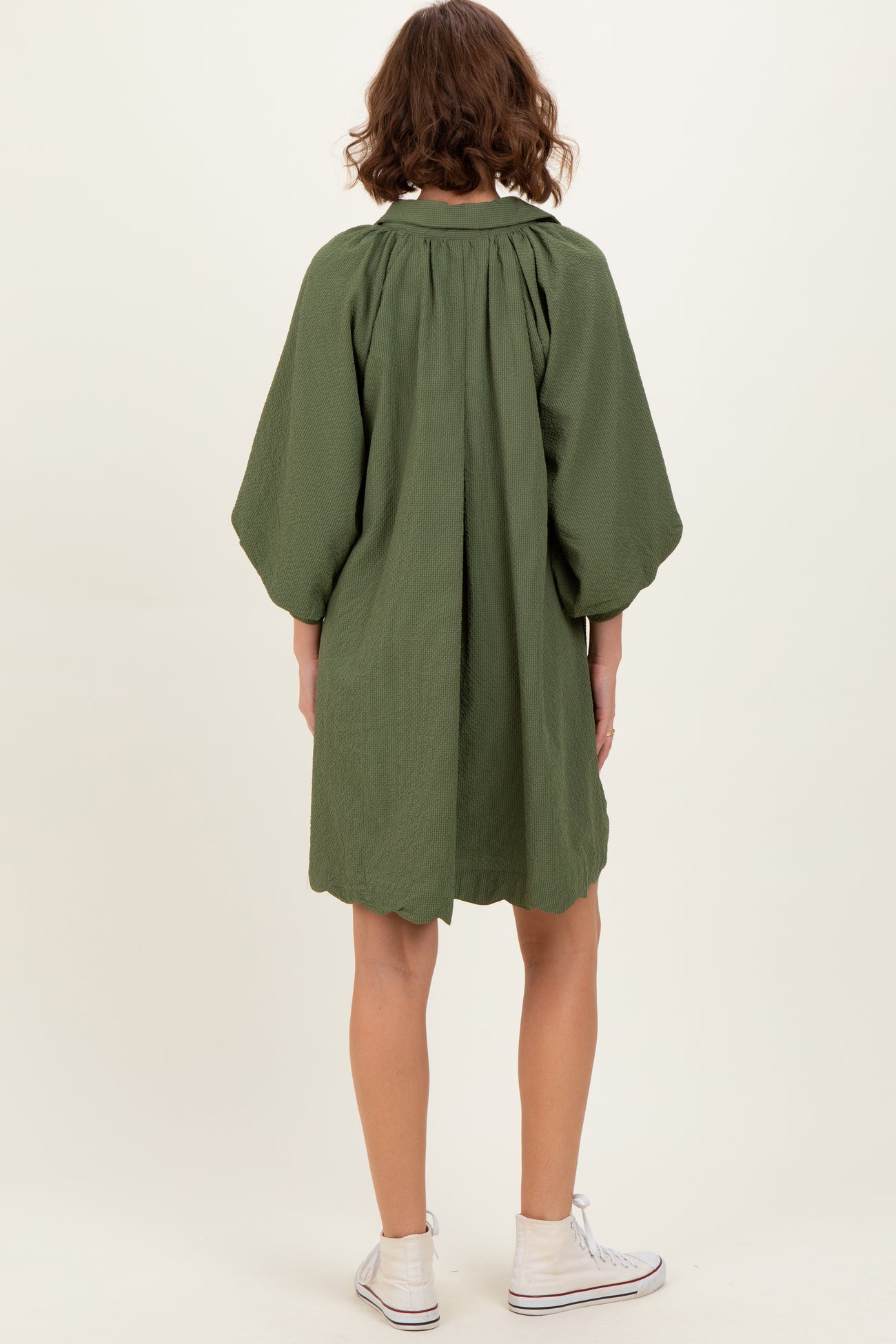 Olive Textured Collared 3/4 Puff Sleeve Dress