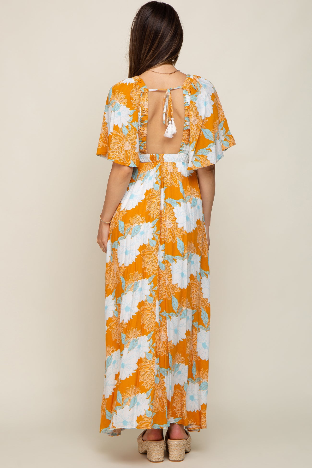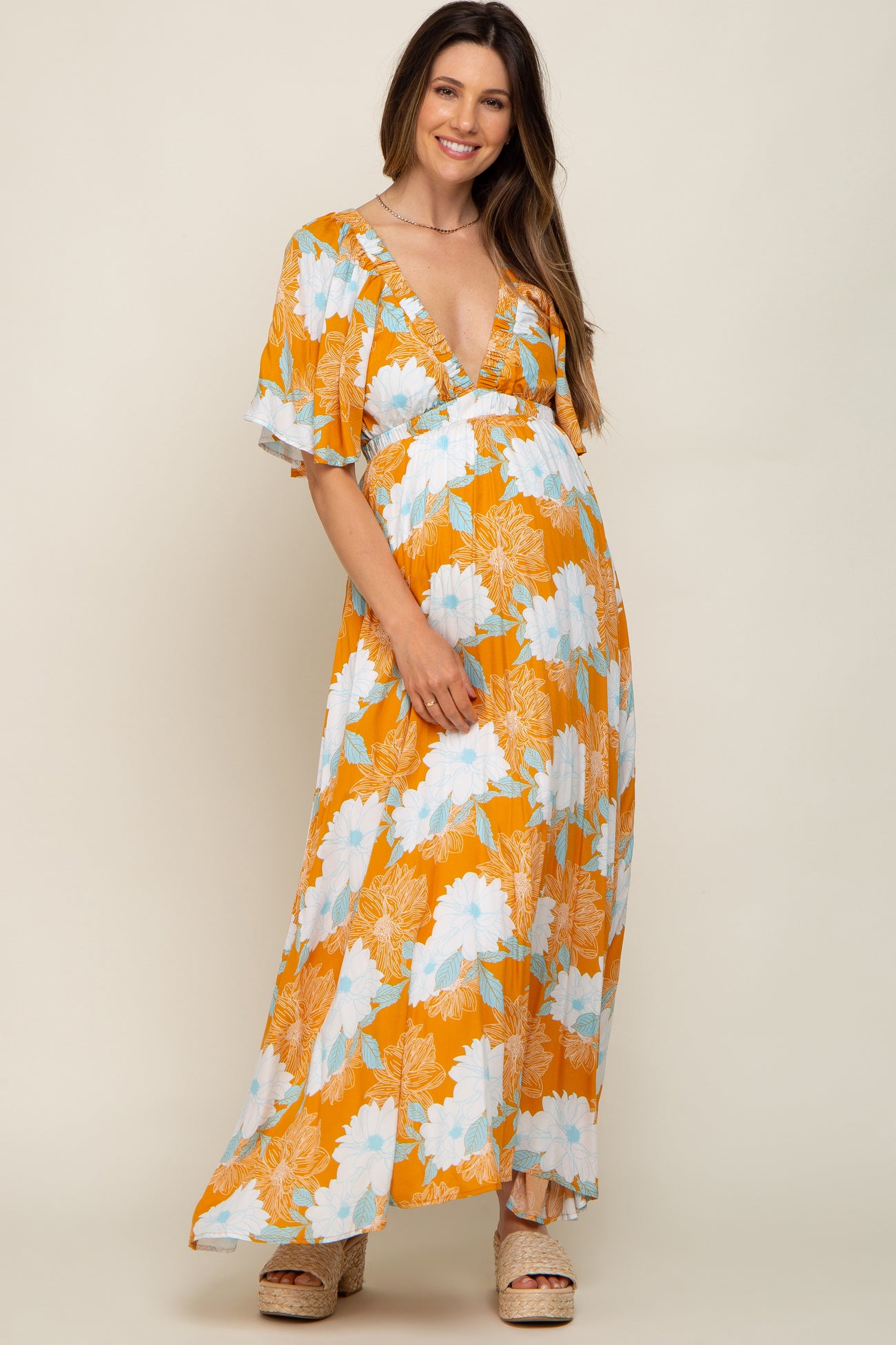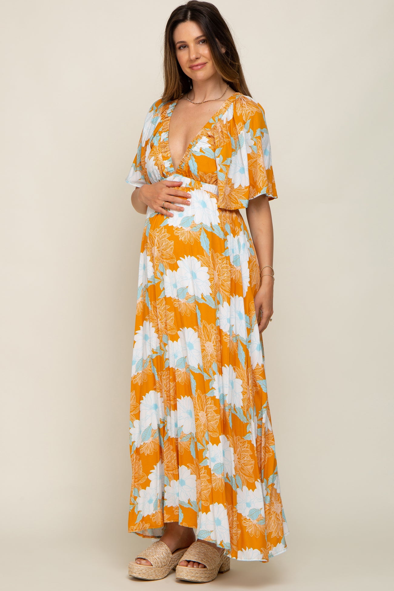 Orange Floral Deep V-Neck Maternity Maxi Dress