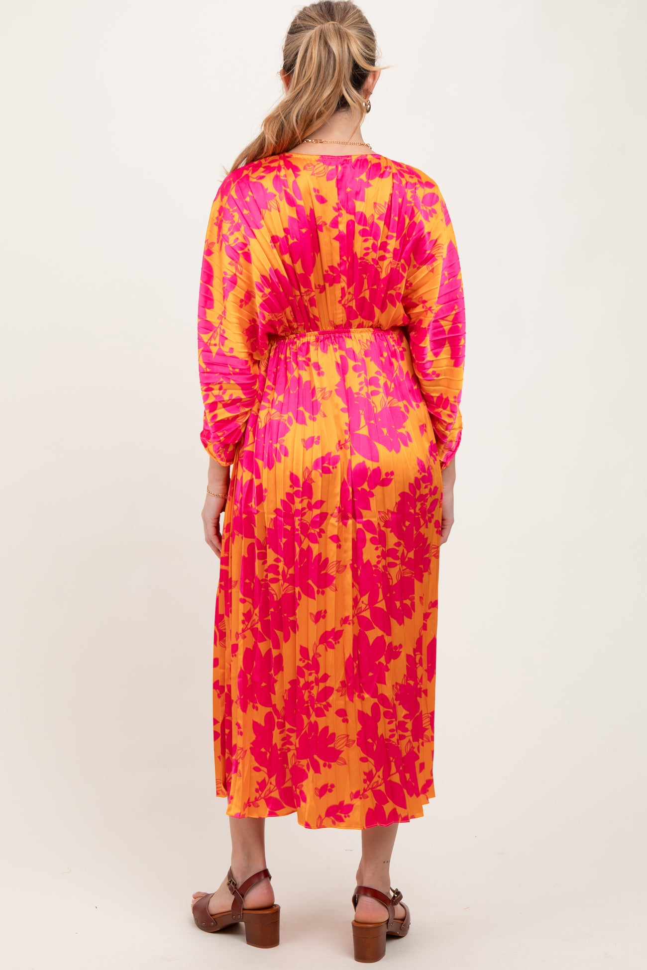 Orange Floral Satin Pleated V-Neck Maternity Maxi Dress