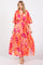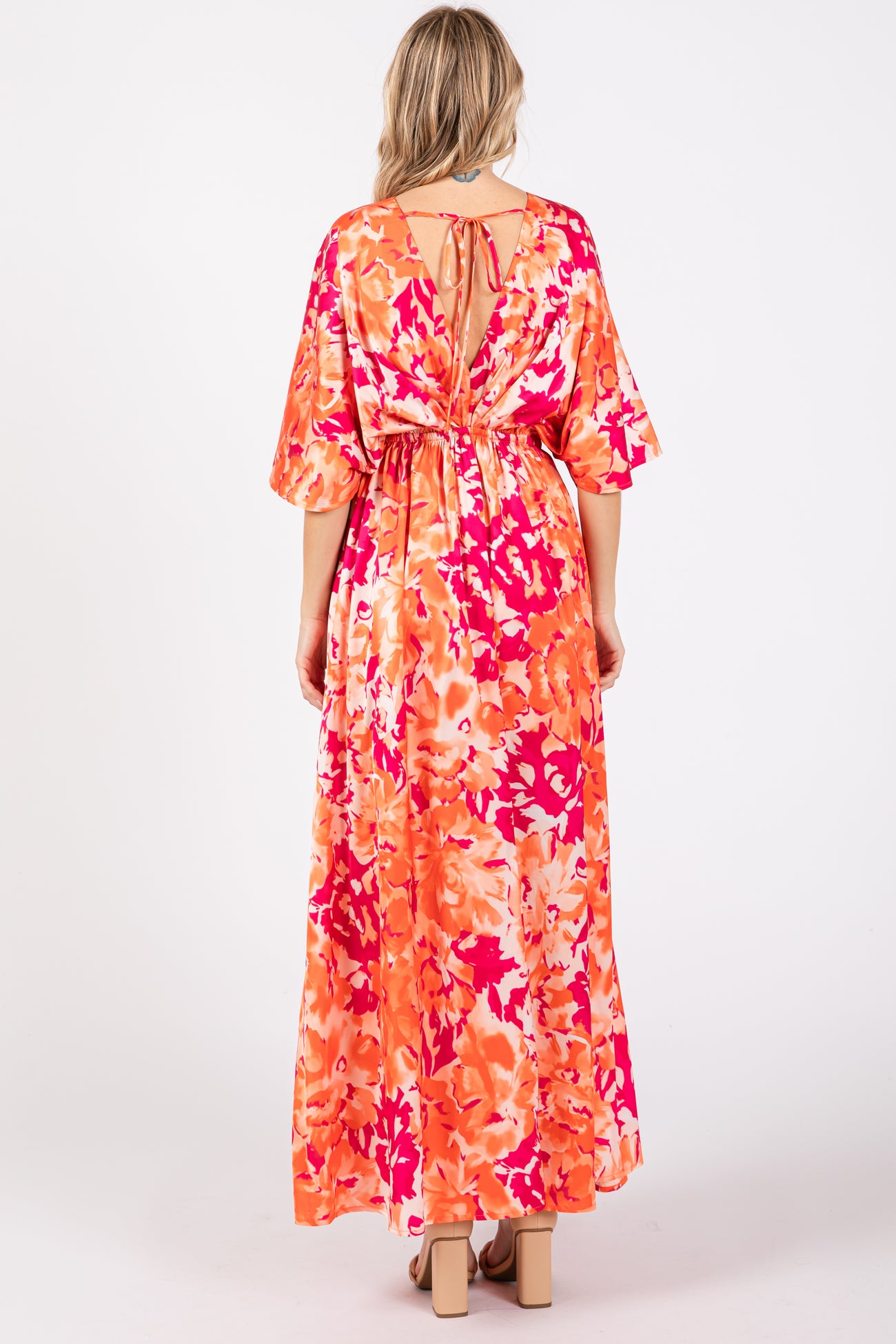 A satin floral maxi dress featuring a v-neckline, short dolman sleeves, an elastic waist, and two front slits.